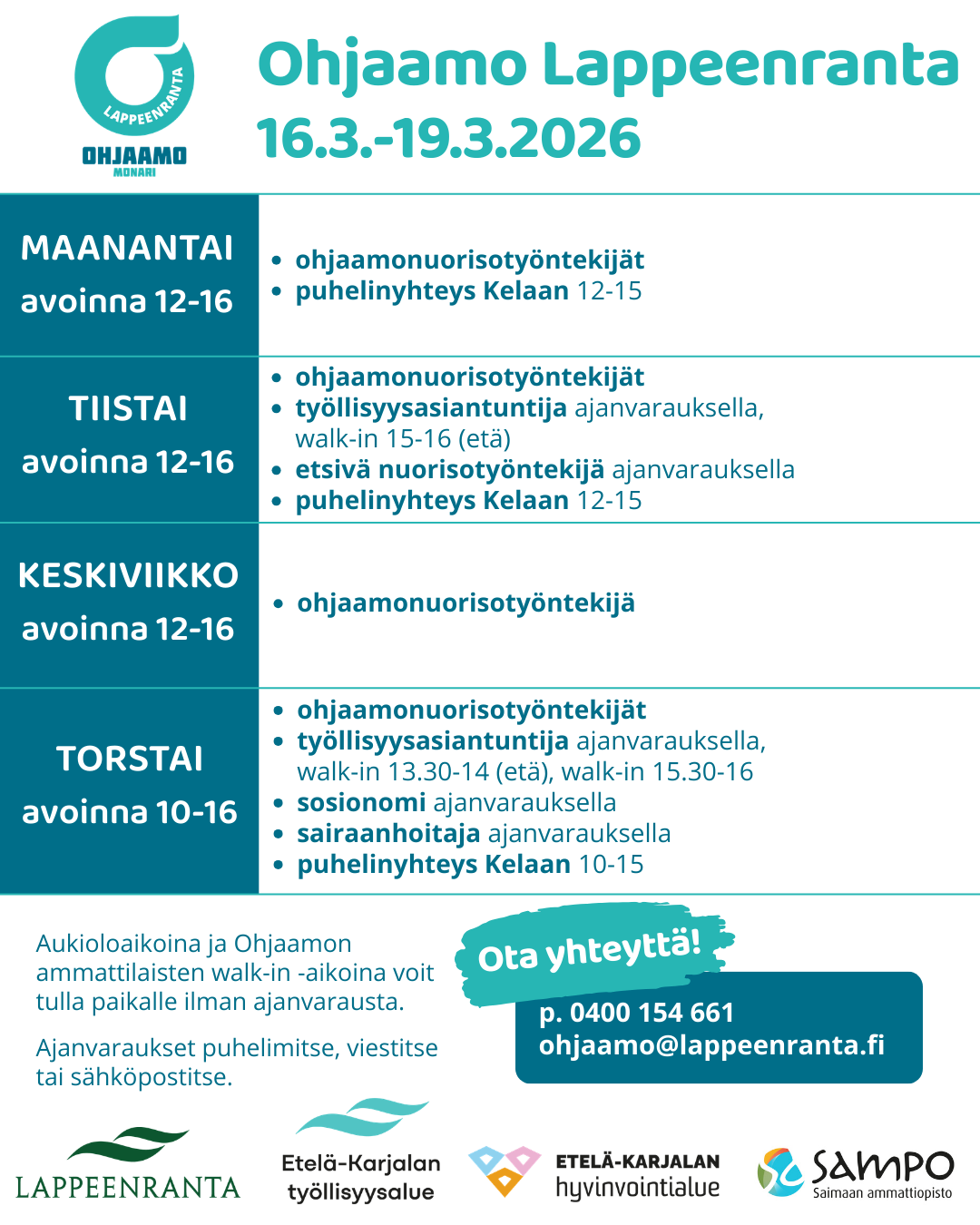 Ajan voit varata puhelimitse, viestitse (myös whatsapp) tai sähköpostitse: p. 0400 154 661 / ohjaamo@lappeenranta.fi. Puheluihin ja viesteihin vastataan aukioloaikoina.