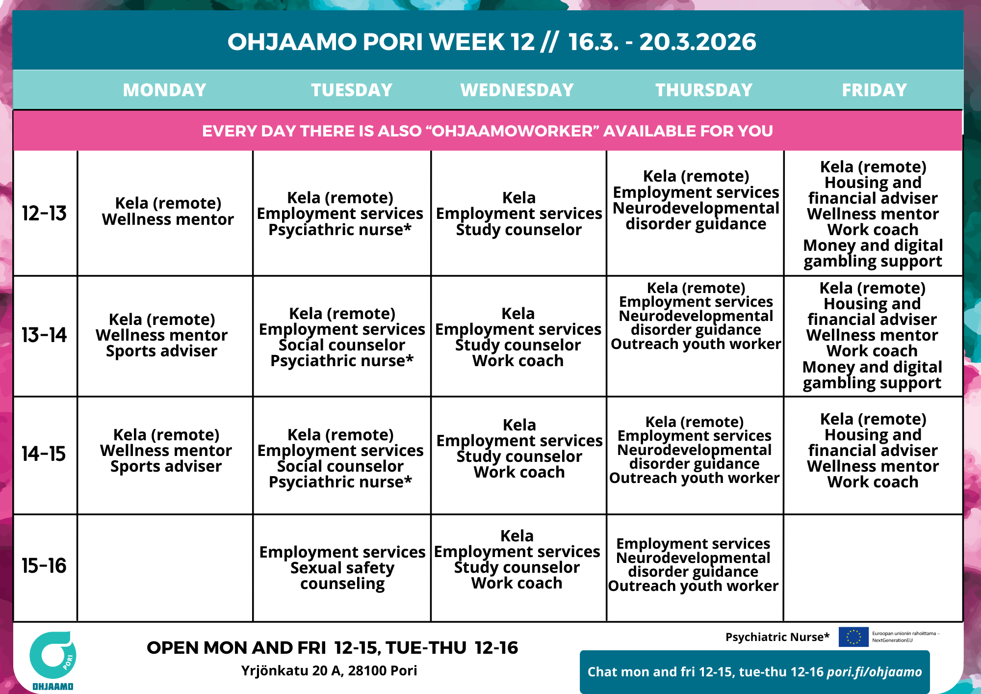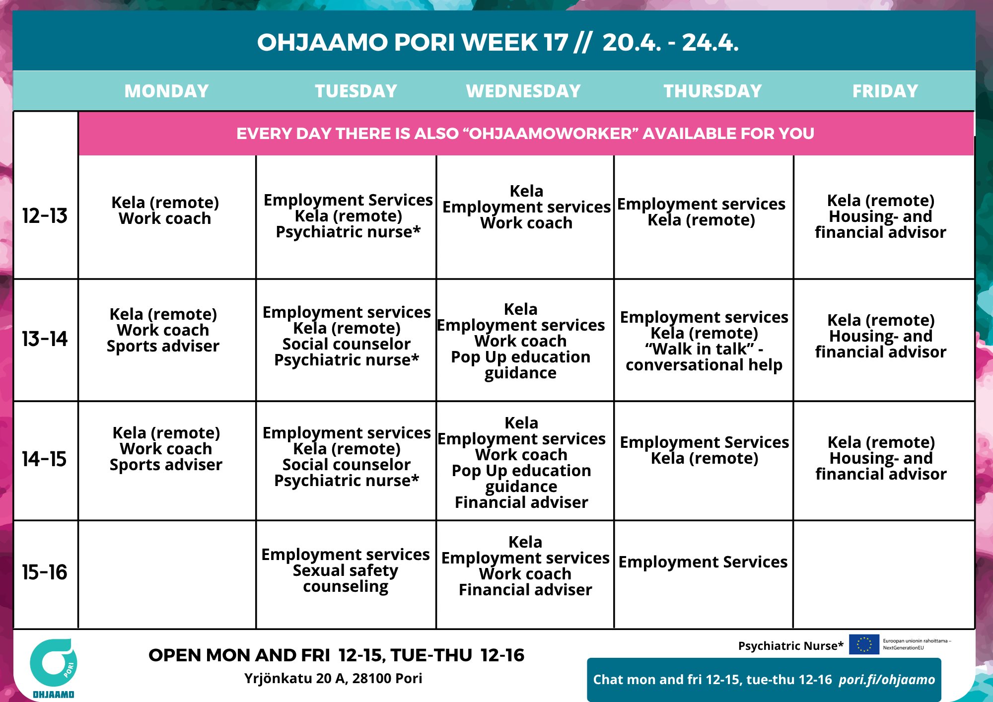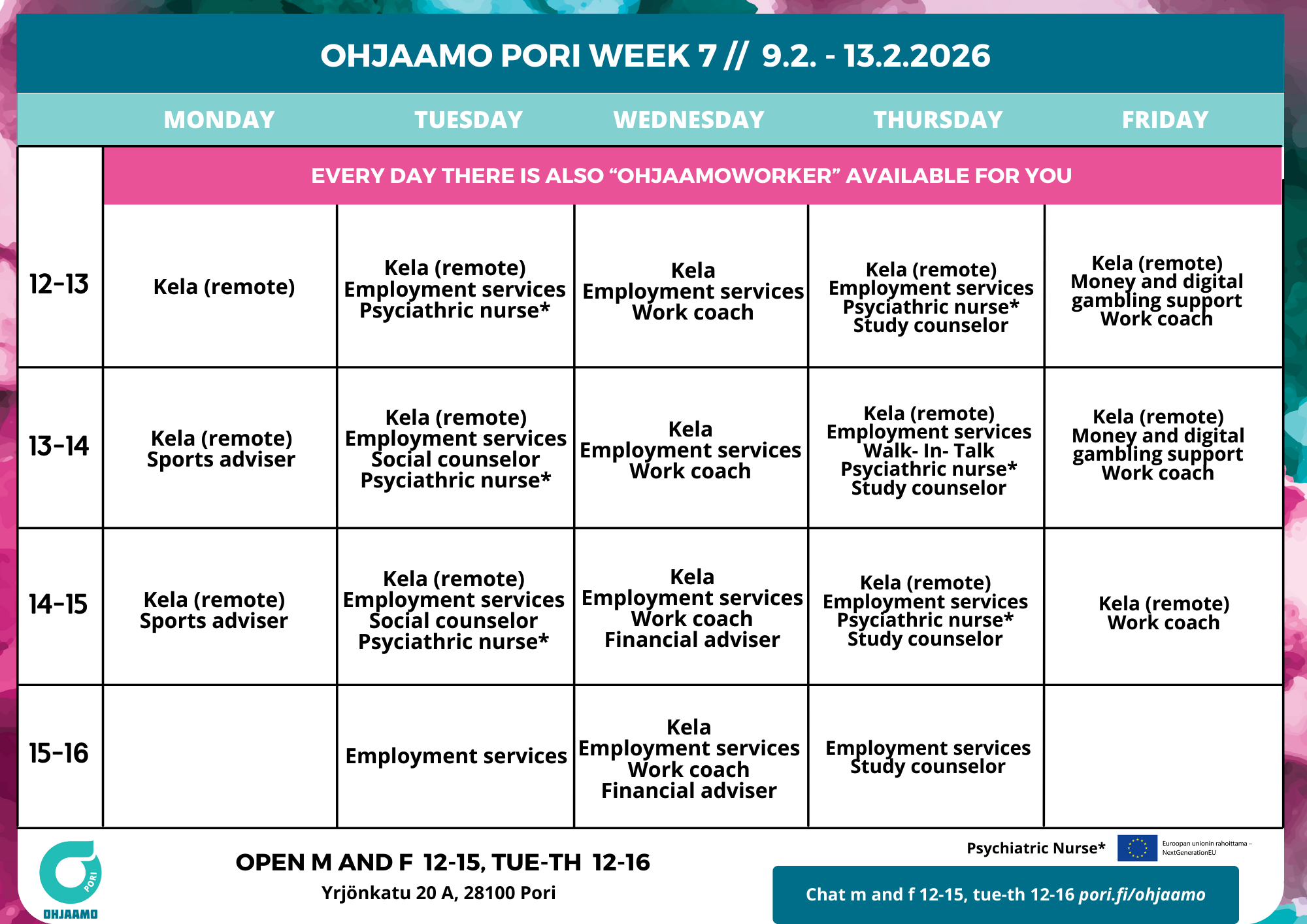 Any changes will be announced on Ohjaamo Pori social media.