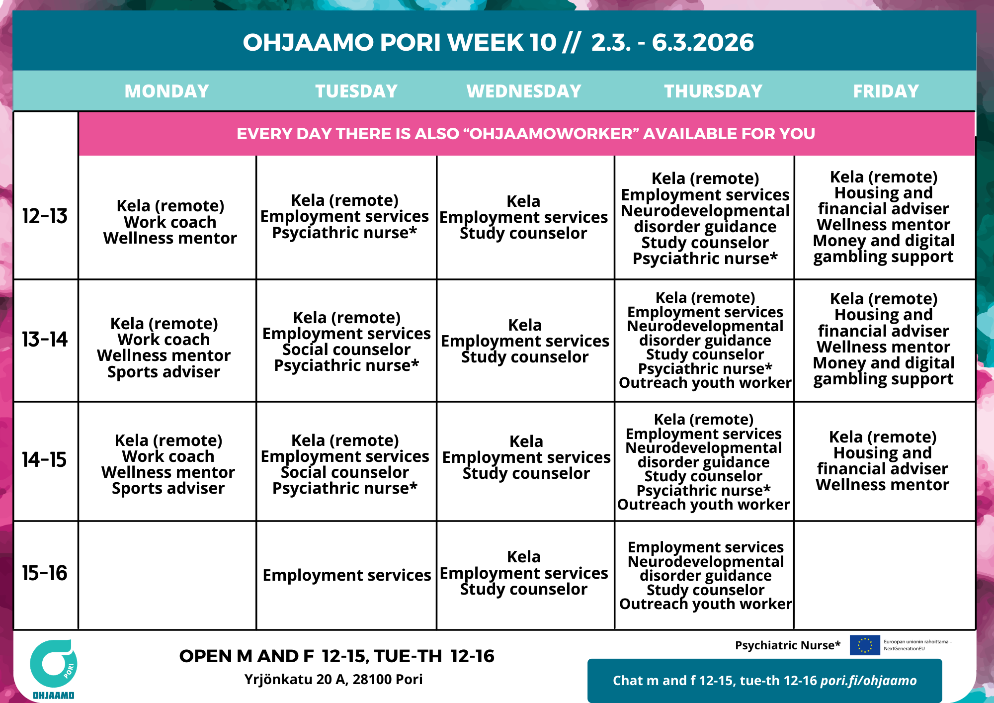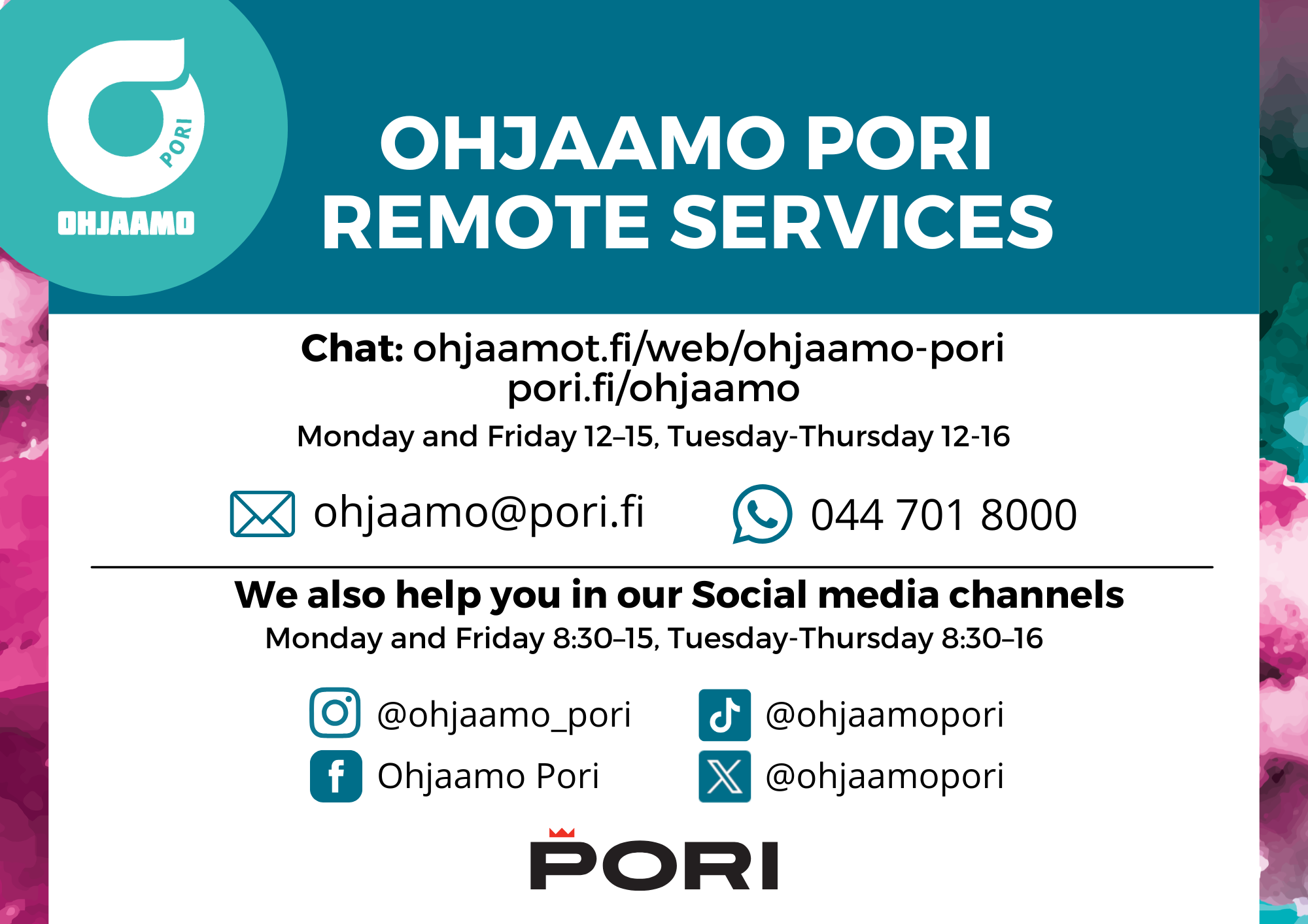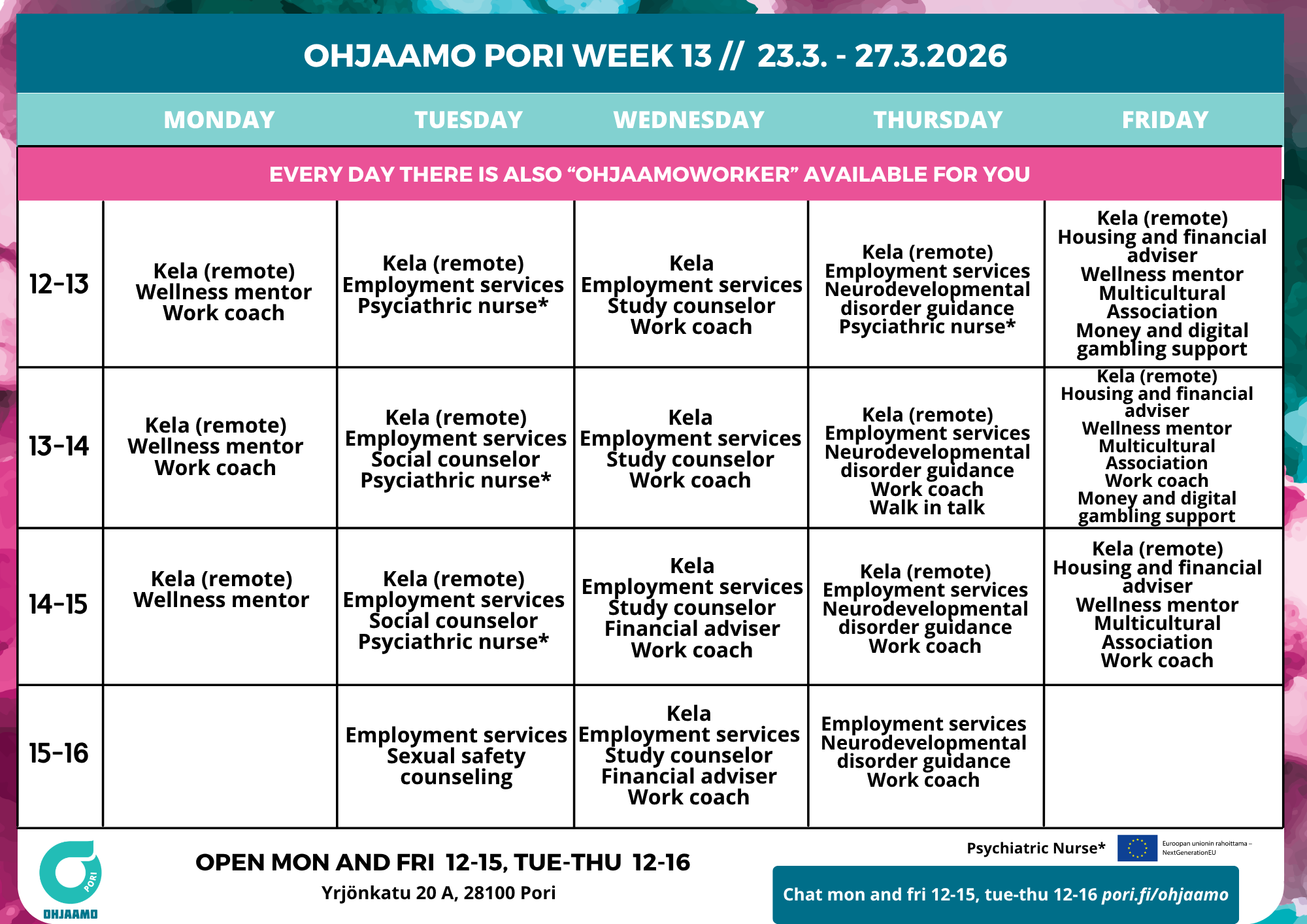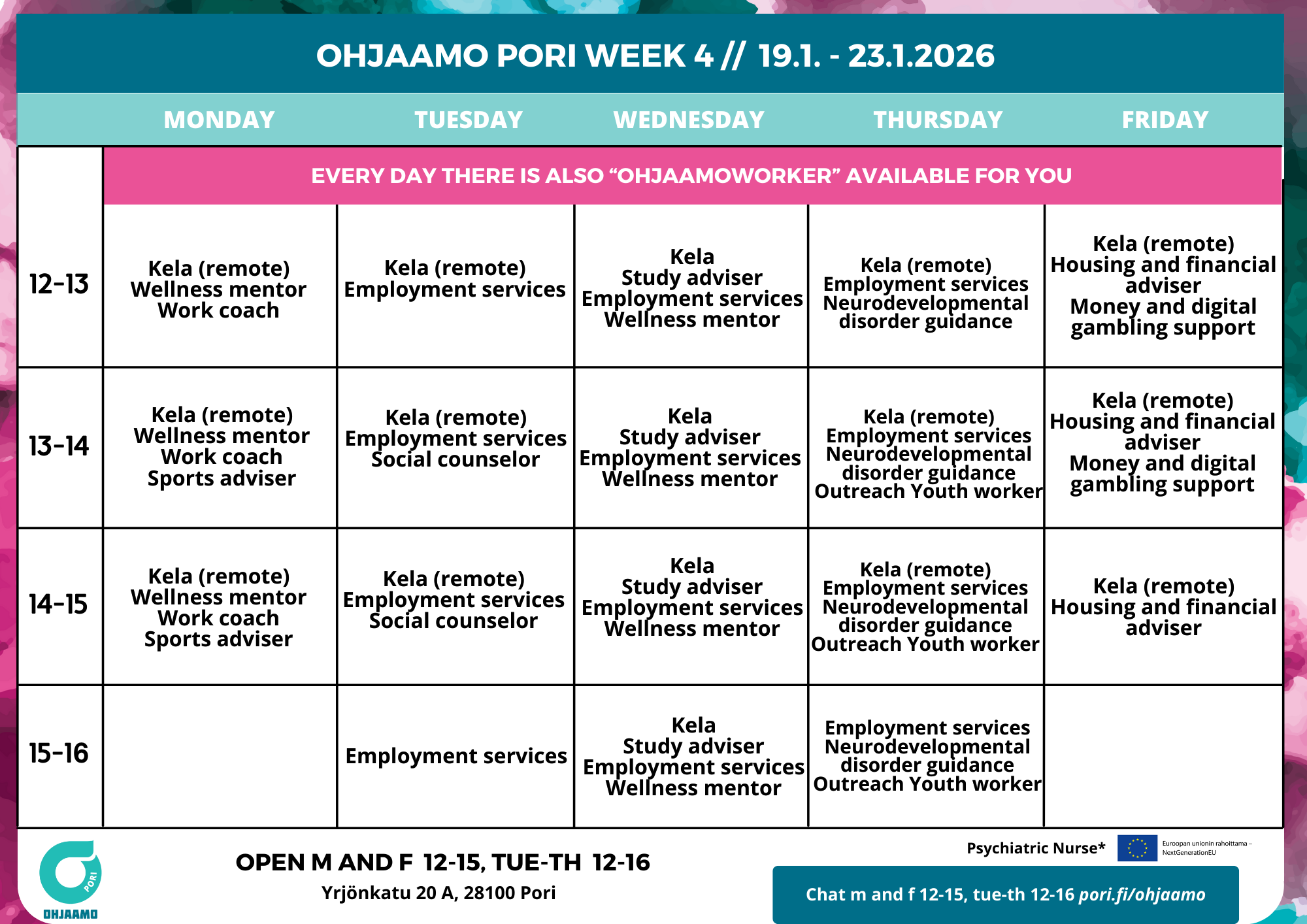 Any changes will be announced on Ohjaamo Pori social media.