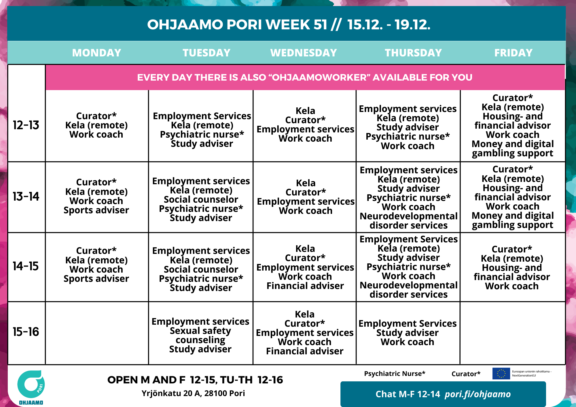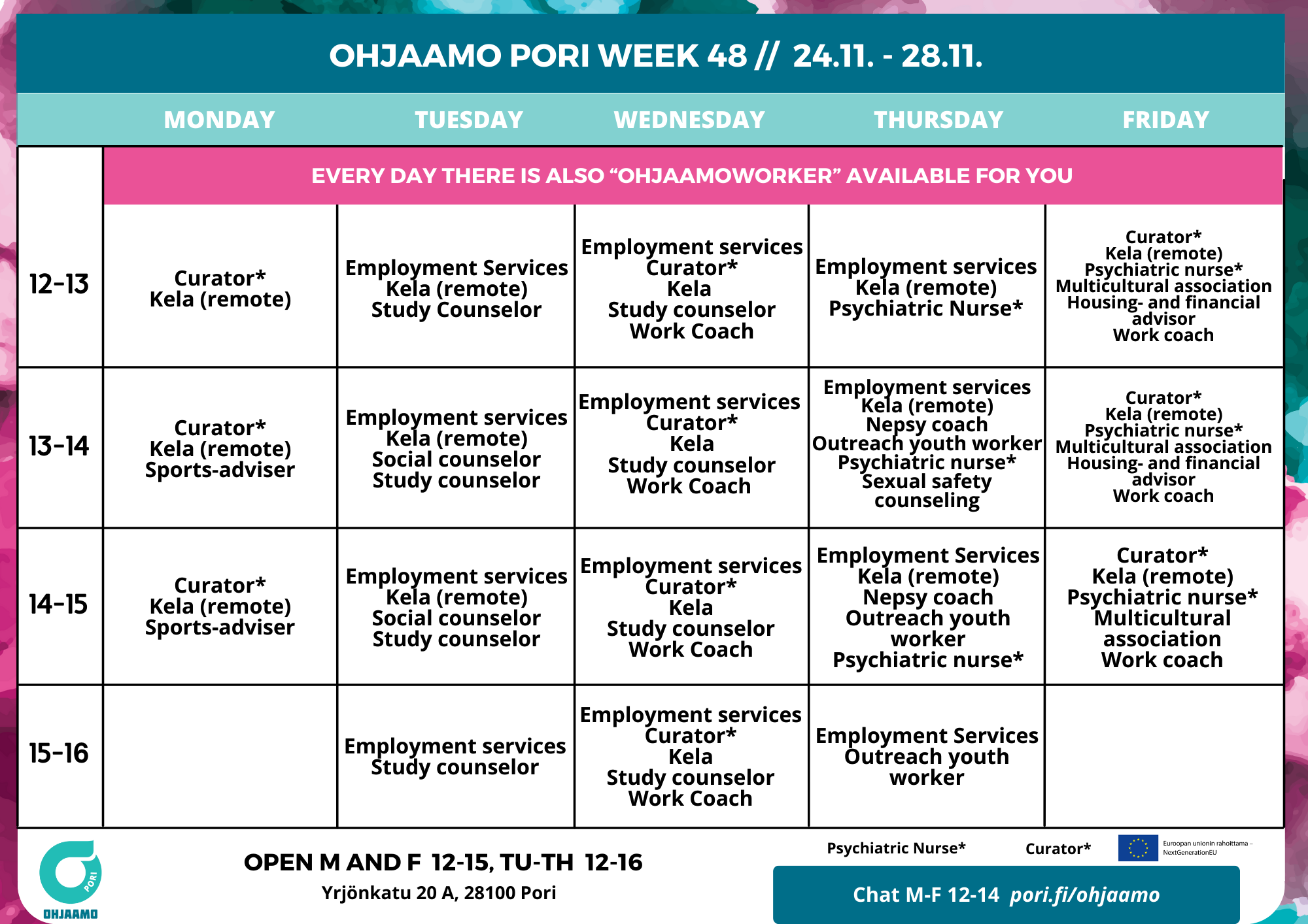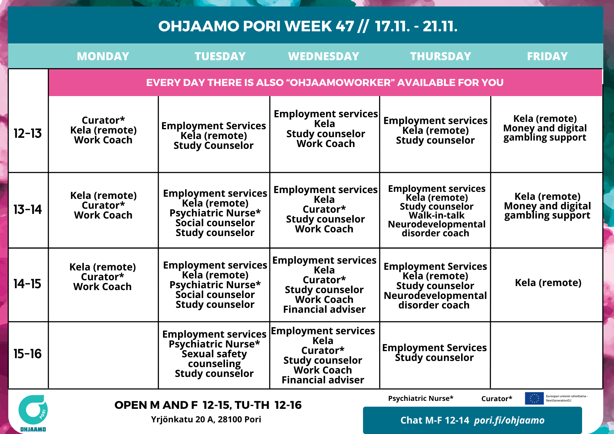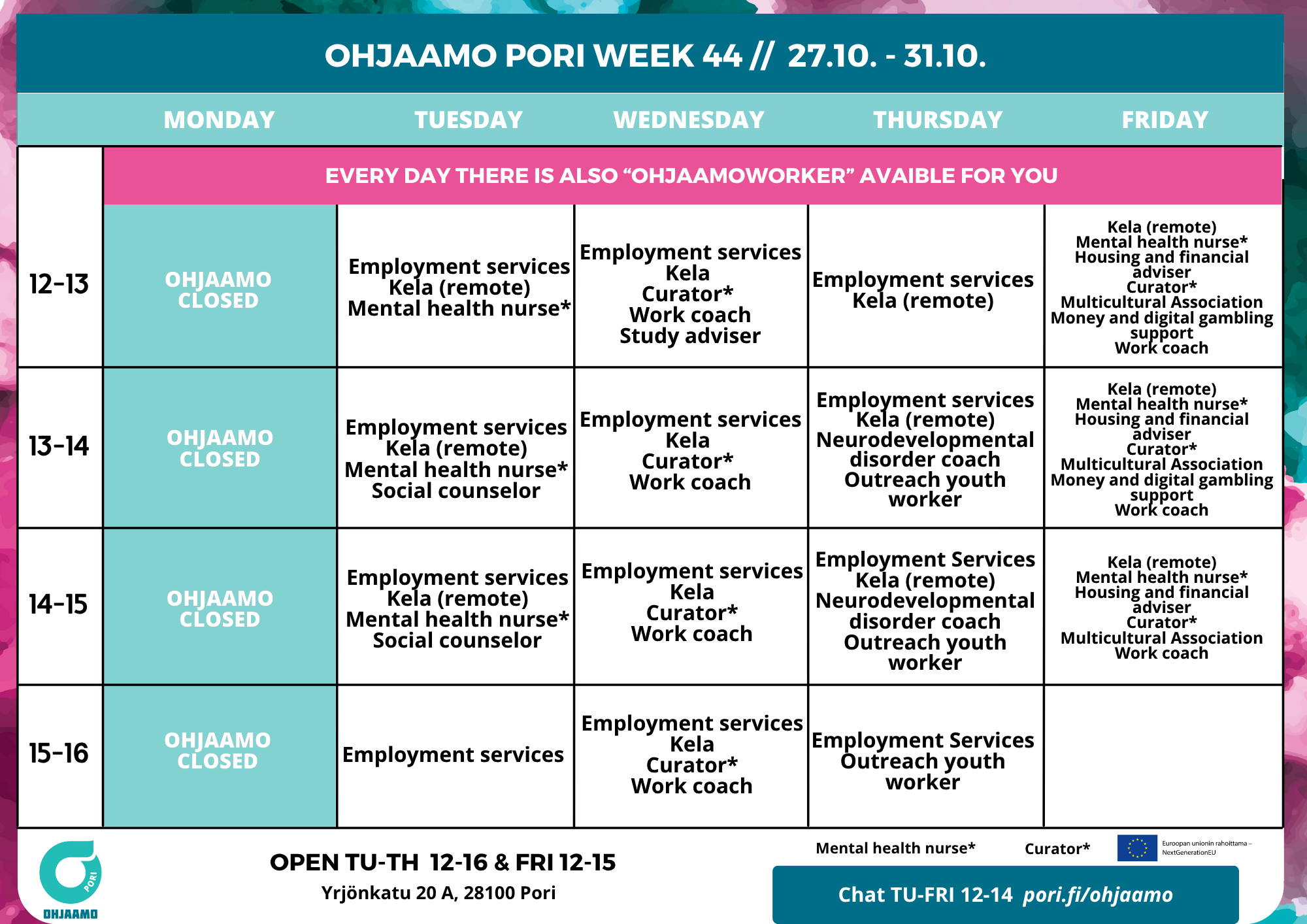 The schedule shows you which professionals are available to meet with at Ohjaamo on which day and which services are available remotely.