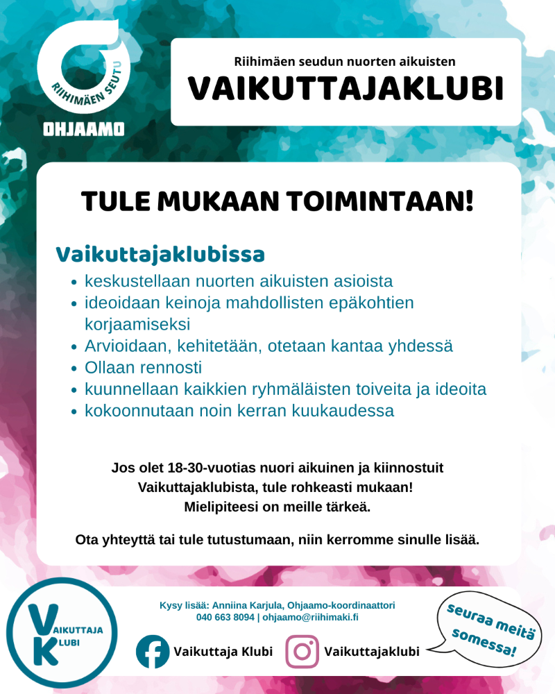 Riihimäen seudun Ohjaamon nuorten aikuisten Vaikuttajaklubi kokoontuu noin kerran kuukaudessa. Tule rohkeasti mukaan rentoon porukkaan kehittämään Ohjaamon toimintaa ja keskustelemaan laajasti nuorten aikuisten asioista.