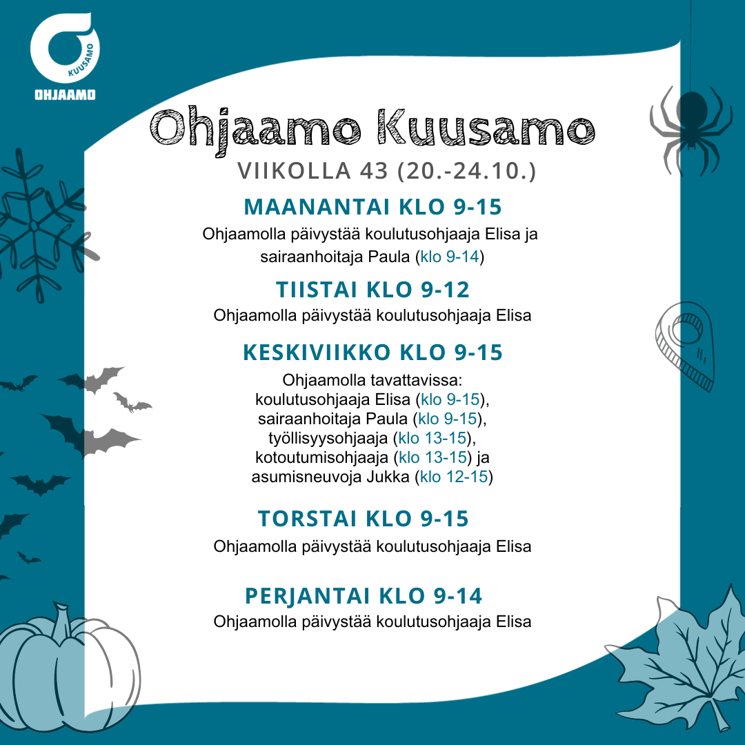 Nuorten alle 30-vuotiaiden palvelut samasta paikasta. Kuusamon Ohjaamo tarjoaa tietoa, tukea ja ohjausta mm. työllistymiseen, kouluttautumiseen ja arjen hallintaan. Jos et tiedä mistä aloittaa, aloita Ohjaamosta!