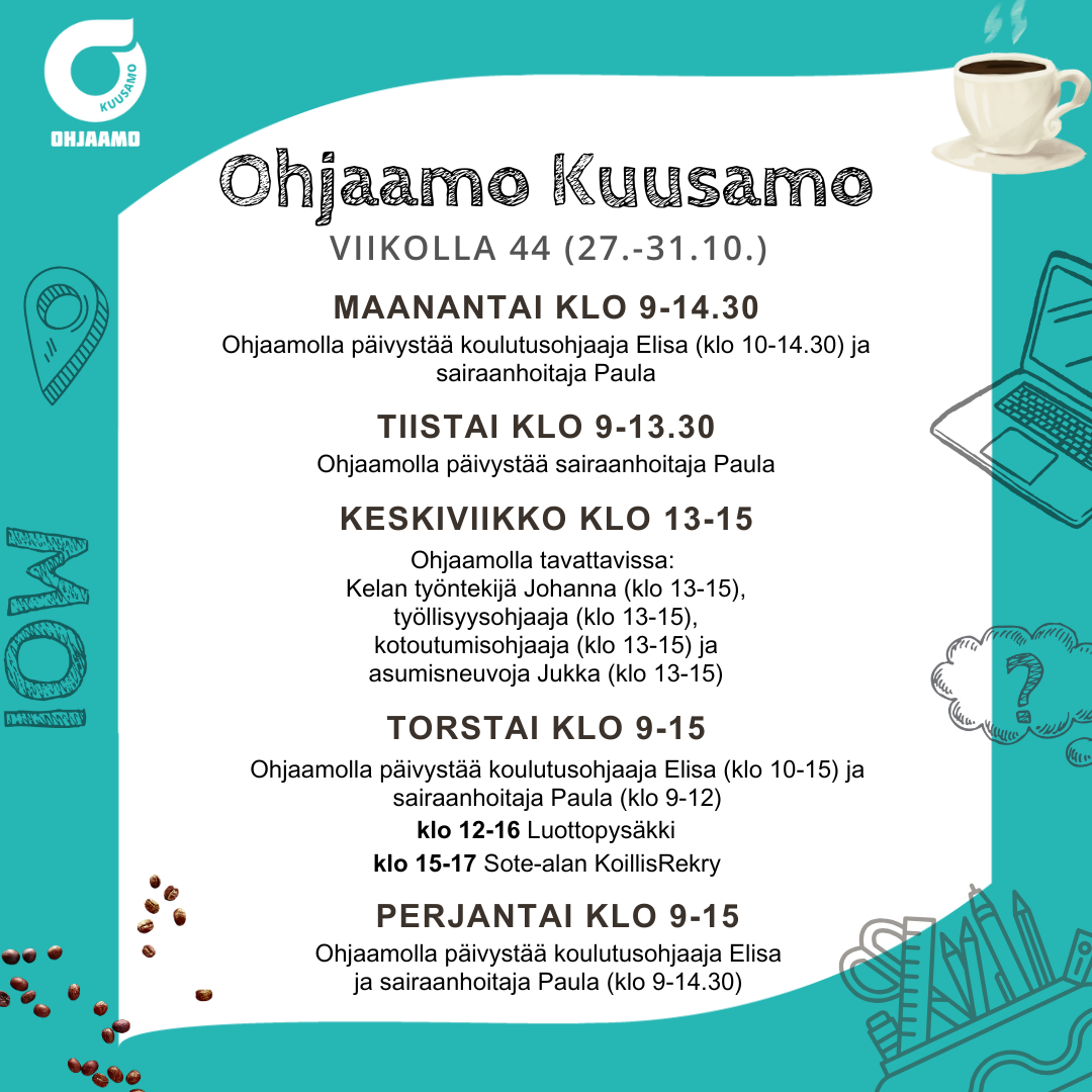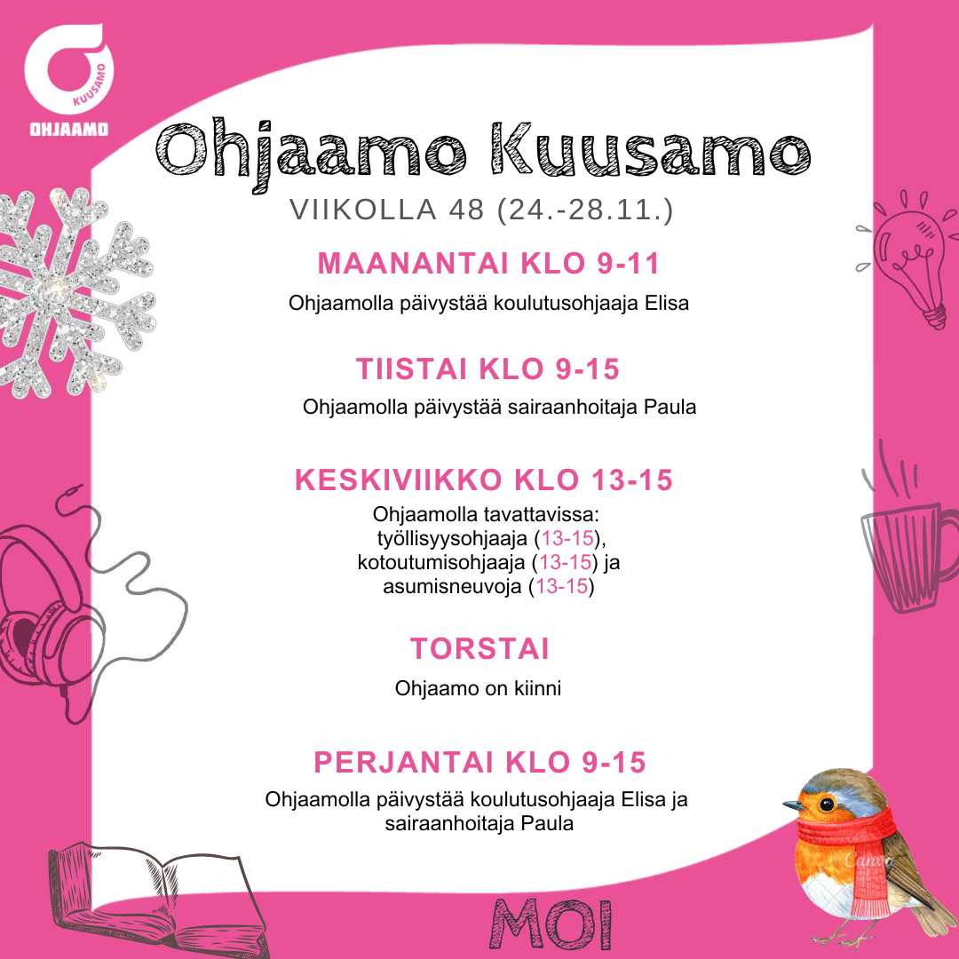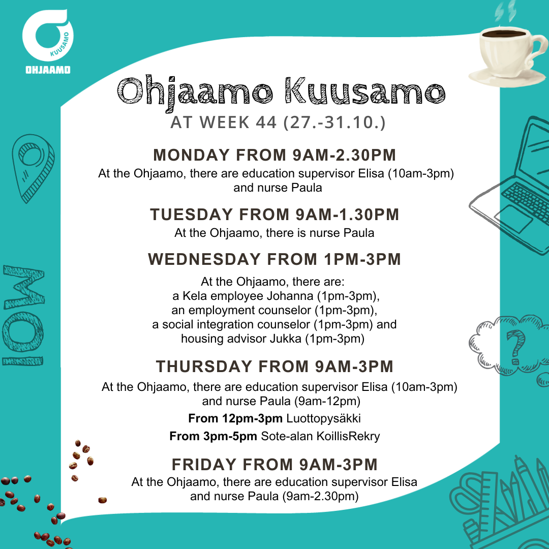 Nuorten alle 30-vuotiaiden palvelut samasta paikasta. Kuusamon Ohjaamo tarjoaa tietoa, tukea ja ohjausta mm. työllistymiseen, kouluttautumiseen ja arjen hallintaan. Jos et tiedä mistä aloittaa, aloita Ohjaamosta!