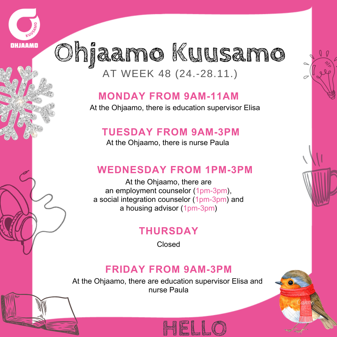 Young people under the age of 30 can access various services in one place. Kuusamo's Ohjaamo provides information, support, and guidance on topics such as employment, education, and everyday life management. If you're unsure where to begin, start with Ohjaamo!"