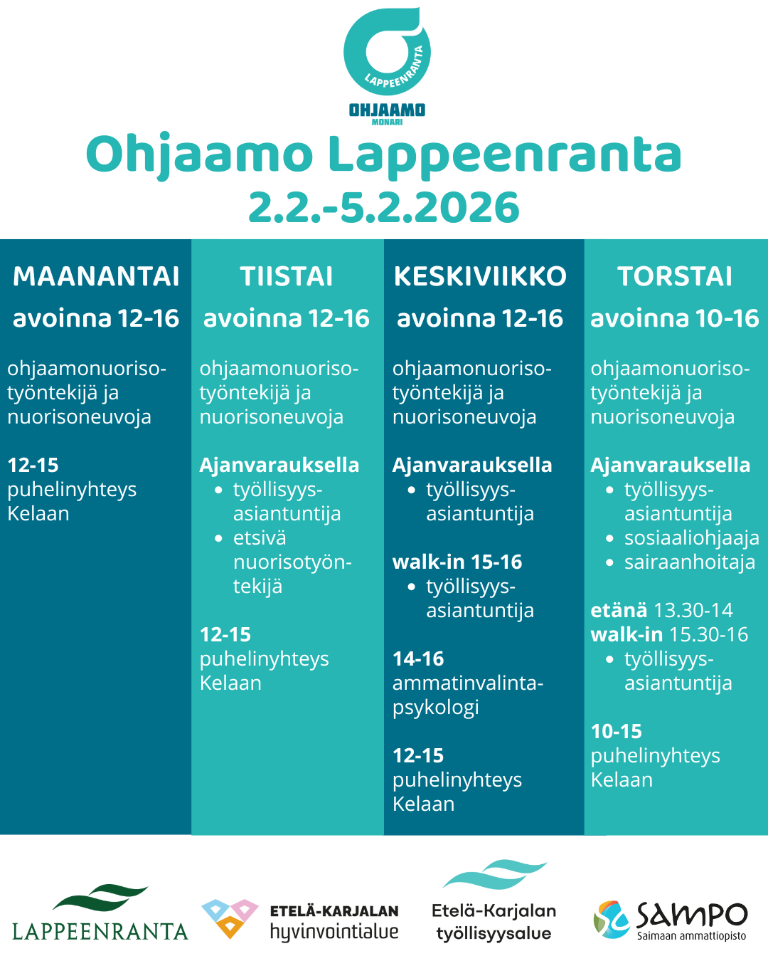 - työllisyysasiantuntija ajanvarauksella sekä kello 13.30-14.00 etäyhteydellä ja kello 15.30-16.00 walk-in -aika ilman ajanvarausta