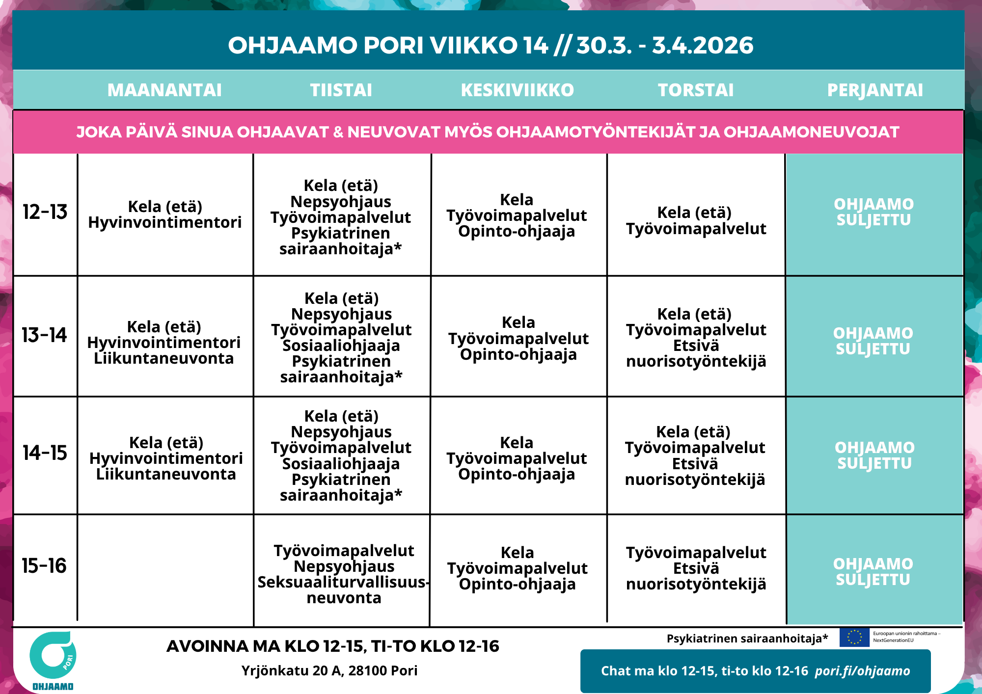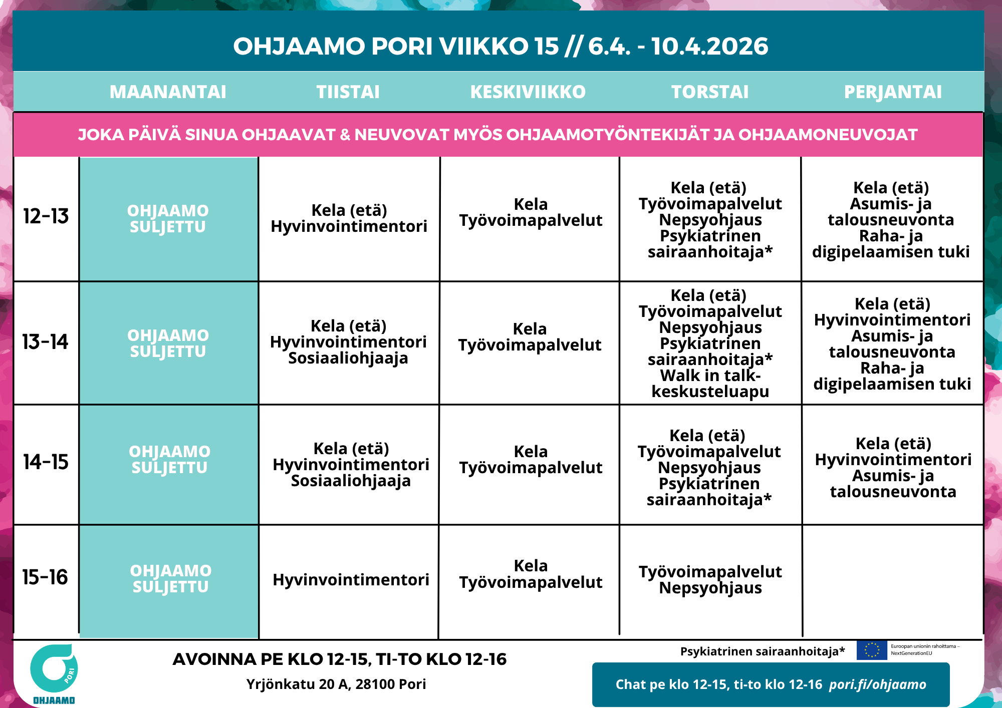 Ohjaamo Porin lukujärjestys vaihtuu viikoittain.