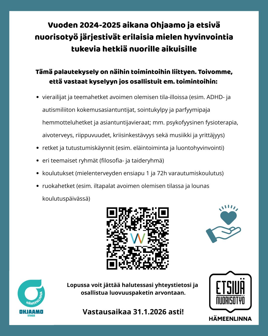 Tämä palautekysely on näihin toimintoihin liittyen. Toivomme, että vastaat kyselyyn jos osallistuit em. toimintoihin: