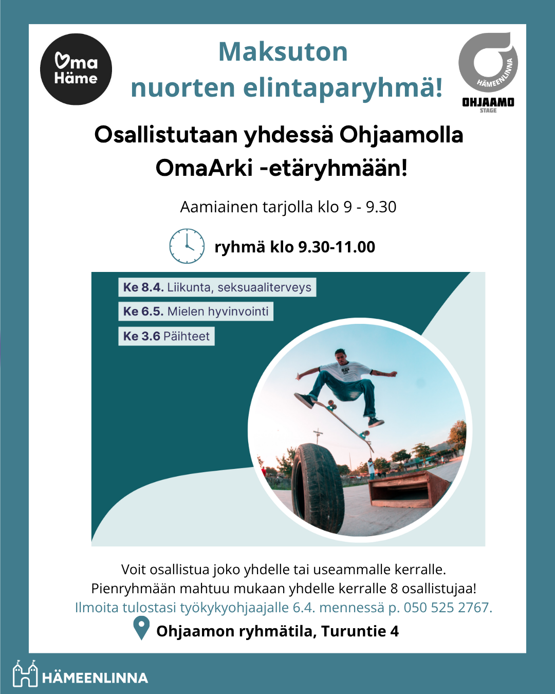Ohjaamolla kokoontuu kevään aikana pieni porukka osallistumaan yhdessä OmaArki -etäryhmään keskiviikkoina 8.4., 6.5. ja 3.6. klo 9.30-11. Ryhmää ennen on myös mahdollisuus ilmaiseen aamupalaan. Ilmoittaudu muaan tai kysy lisää Heliltä 050 525 2767