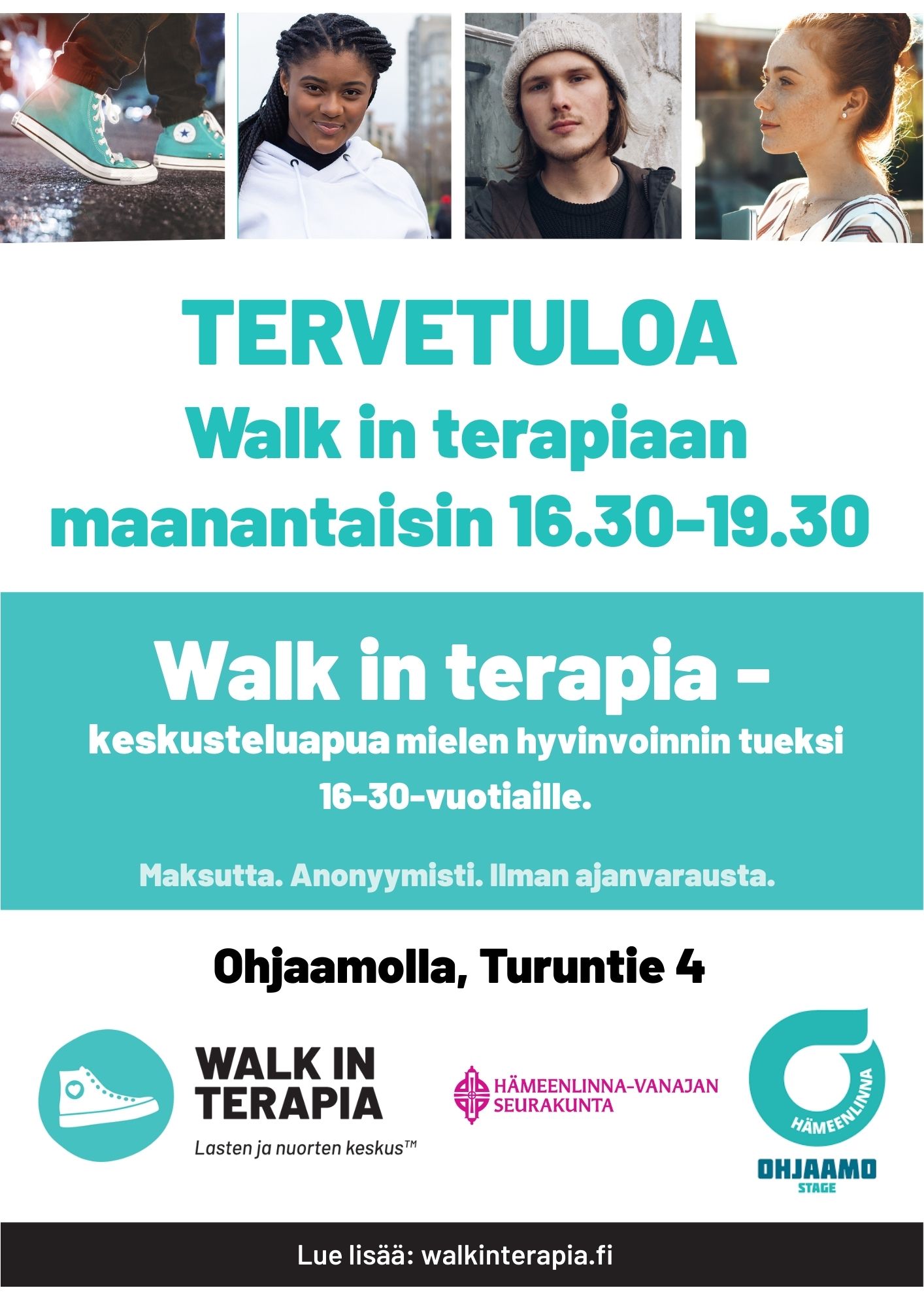 + maanantaisin Avoimen olemisen tila klo 16-20 ja Walk in terapia klo 16.30-19.30