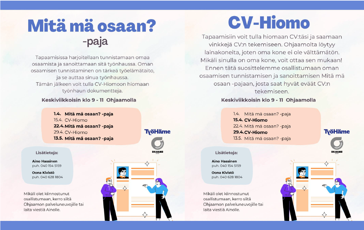 CV hiomon tapaamisiin voit tulla hiomaan CV:täsi ja saamaan vinkkejä CV:n tekemiseen. Ohjaamolta löytyy lainakoneita, joten oma kone ei ole välttämätön. Mikäli sinulla on oma kone, voit ottaa sen mukaan!
