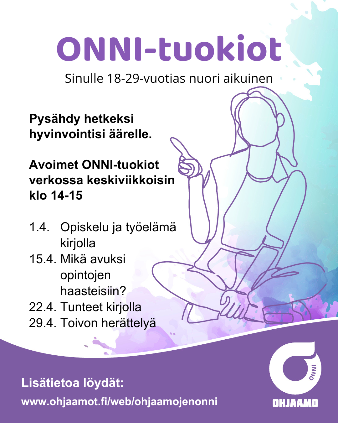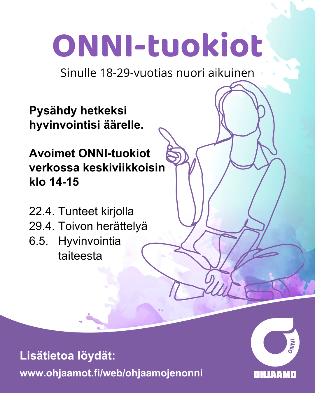 Tarkemmat tiedot ja ilmoittautumisohjeet Ohjaamojen Onnin tarjoamista palveluista: https://ohjaamot.fi/web/ohjaamojenonni/palvelut1