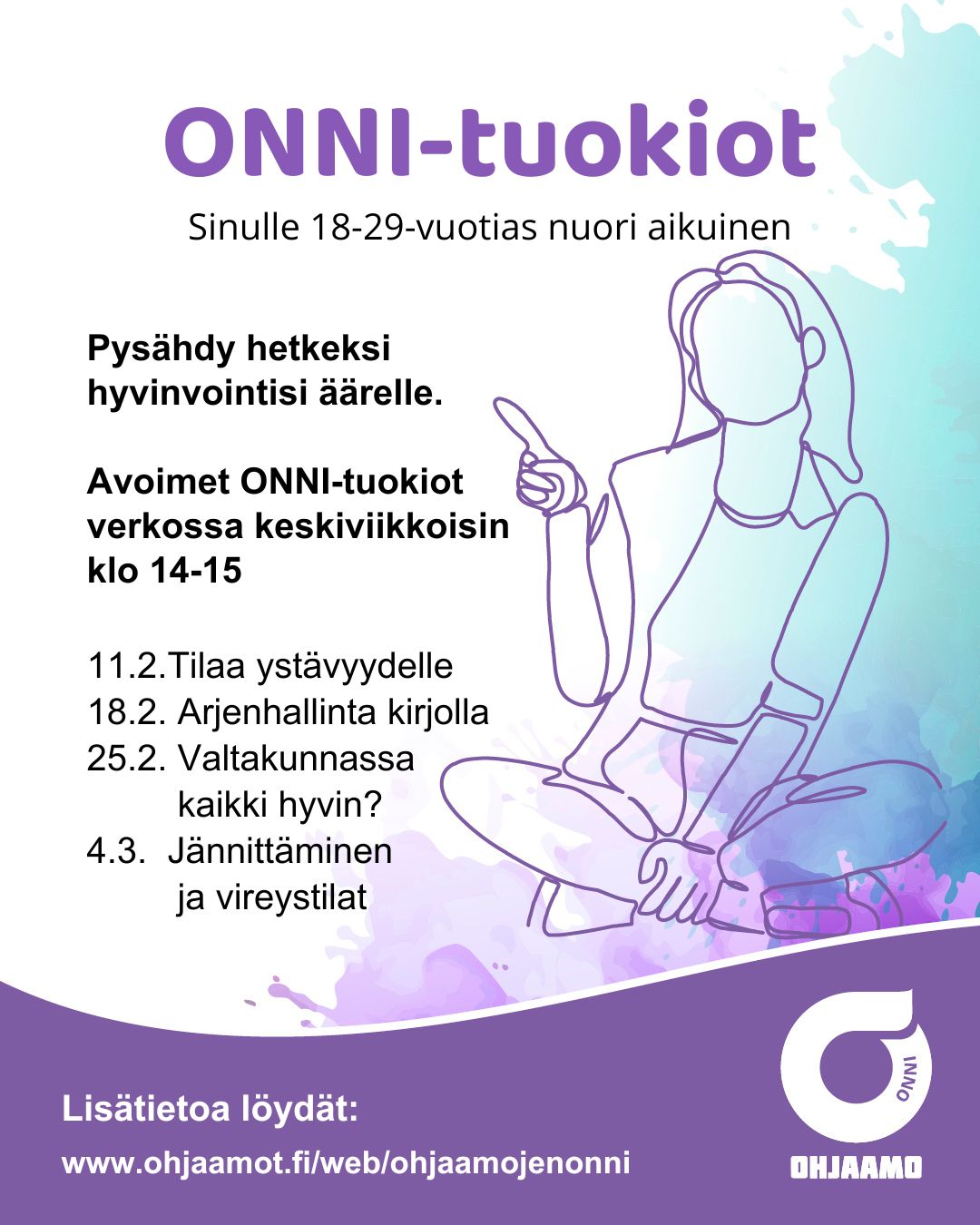 Tarkemmat tiedot ja ilmoittautumisohjeet Ohjaamojen Onnin tarjoamista palveluista: https://ohjaamot.fi/web/ohjaamojenonni/palvelut1