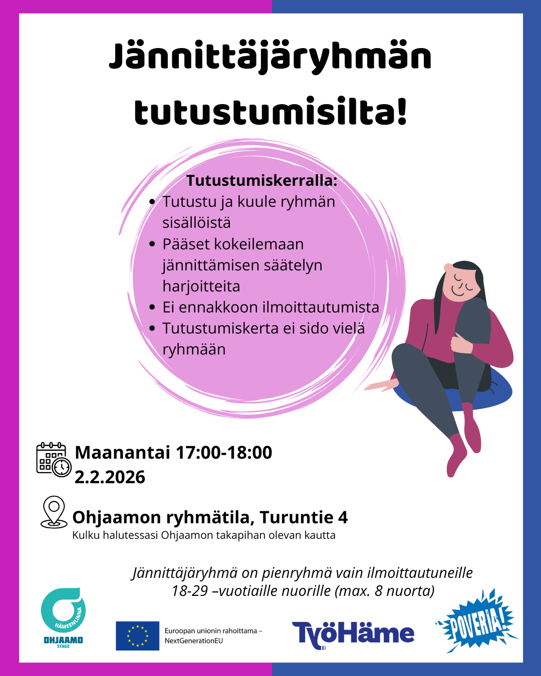 Ryhmä kokoontuu keskiviikkoisin 14.1.-11.2.2026 (5 kertaa) klo 16.00–17.30 Ohjaamon ryhmätilassa, os. Turuntie 4.
