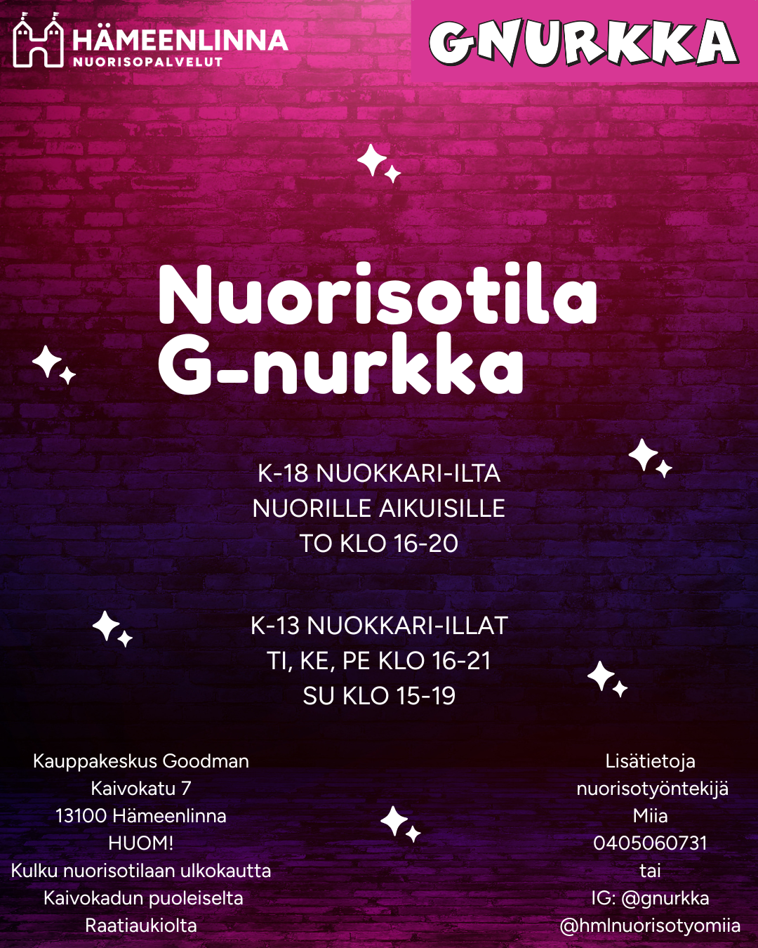 torstaisin - nuorisotila G-nurkan K-18 nuokkari-illat klo 16-20