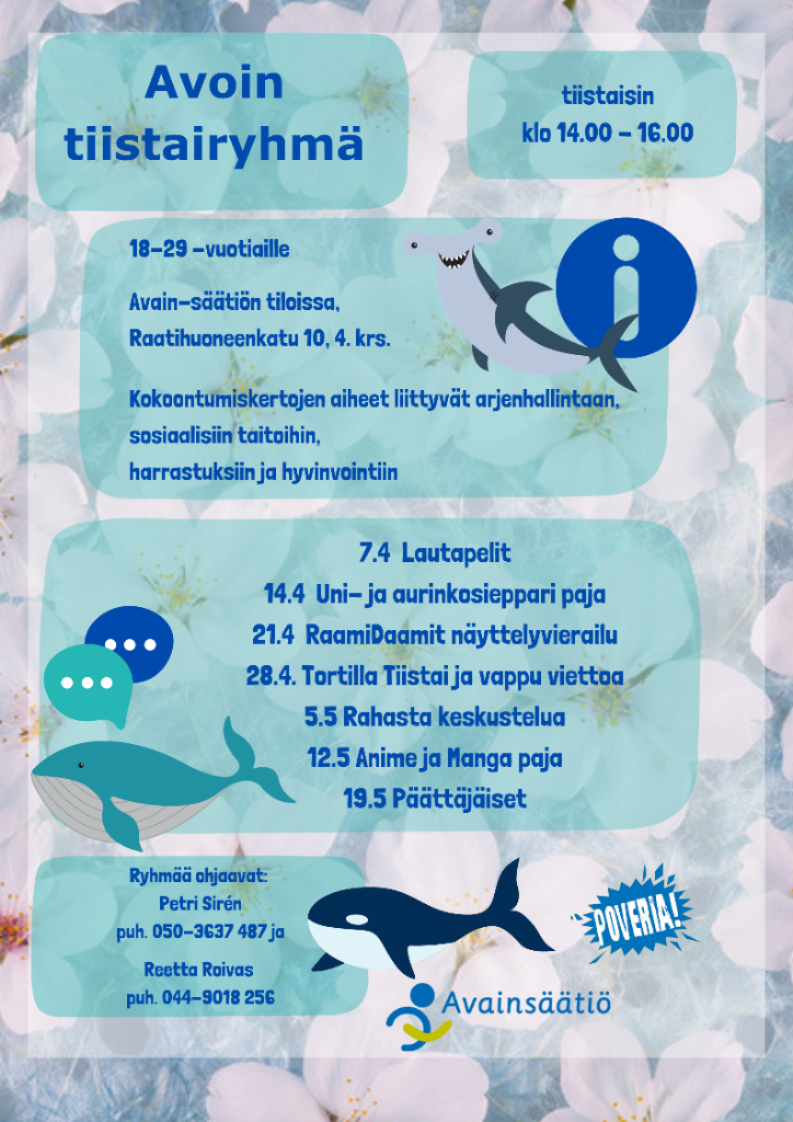 • avoimia tuokioita erilaisista hyvinvoinnin, arjenhallinnan ja neurokirjon teemoista, joihin voit osallistua anonyymisti.