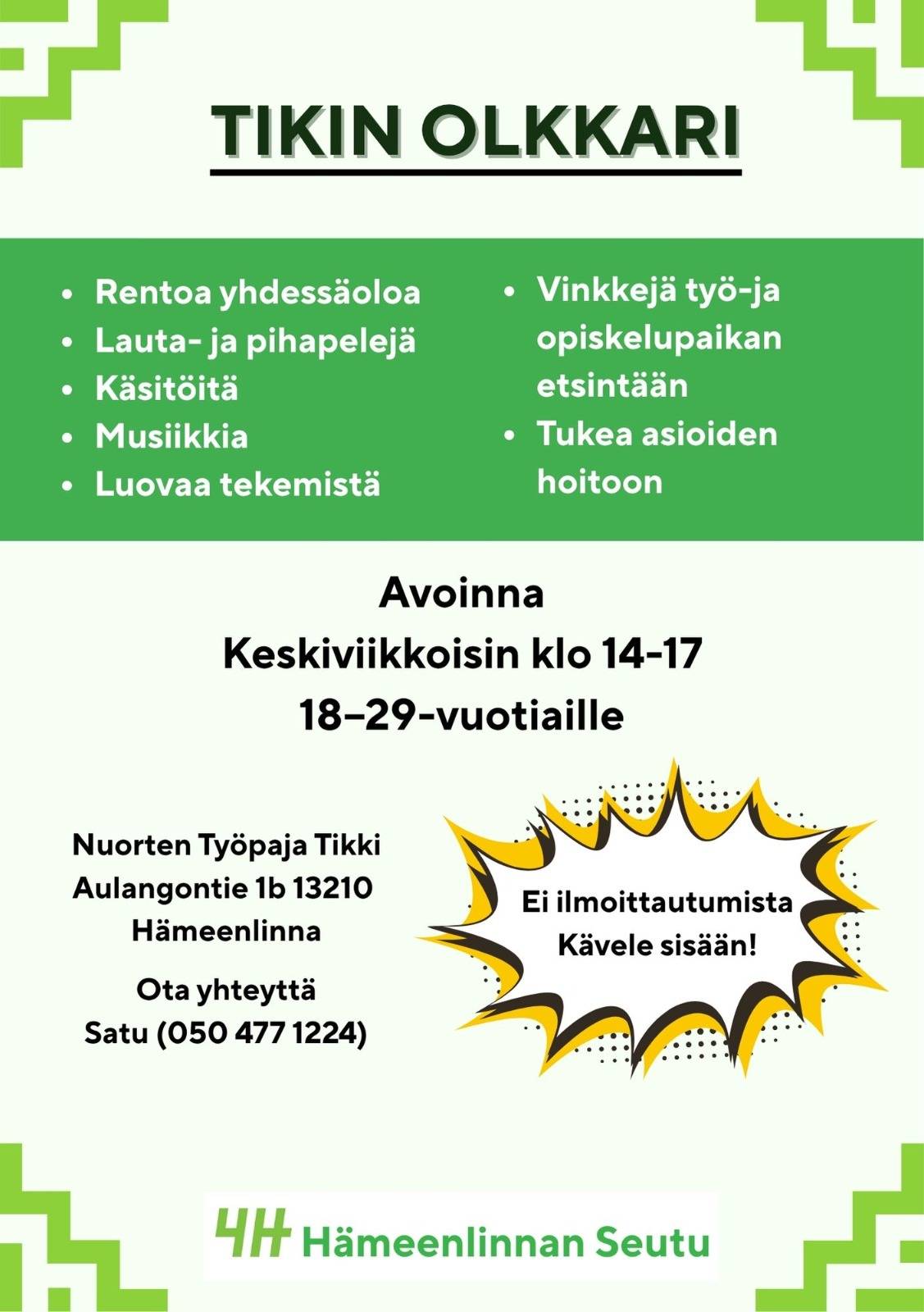 keskiviikkoisin - Tikin olkkari klo 14-17