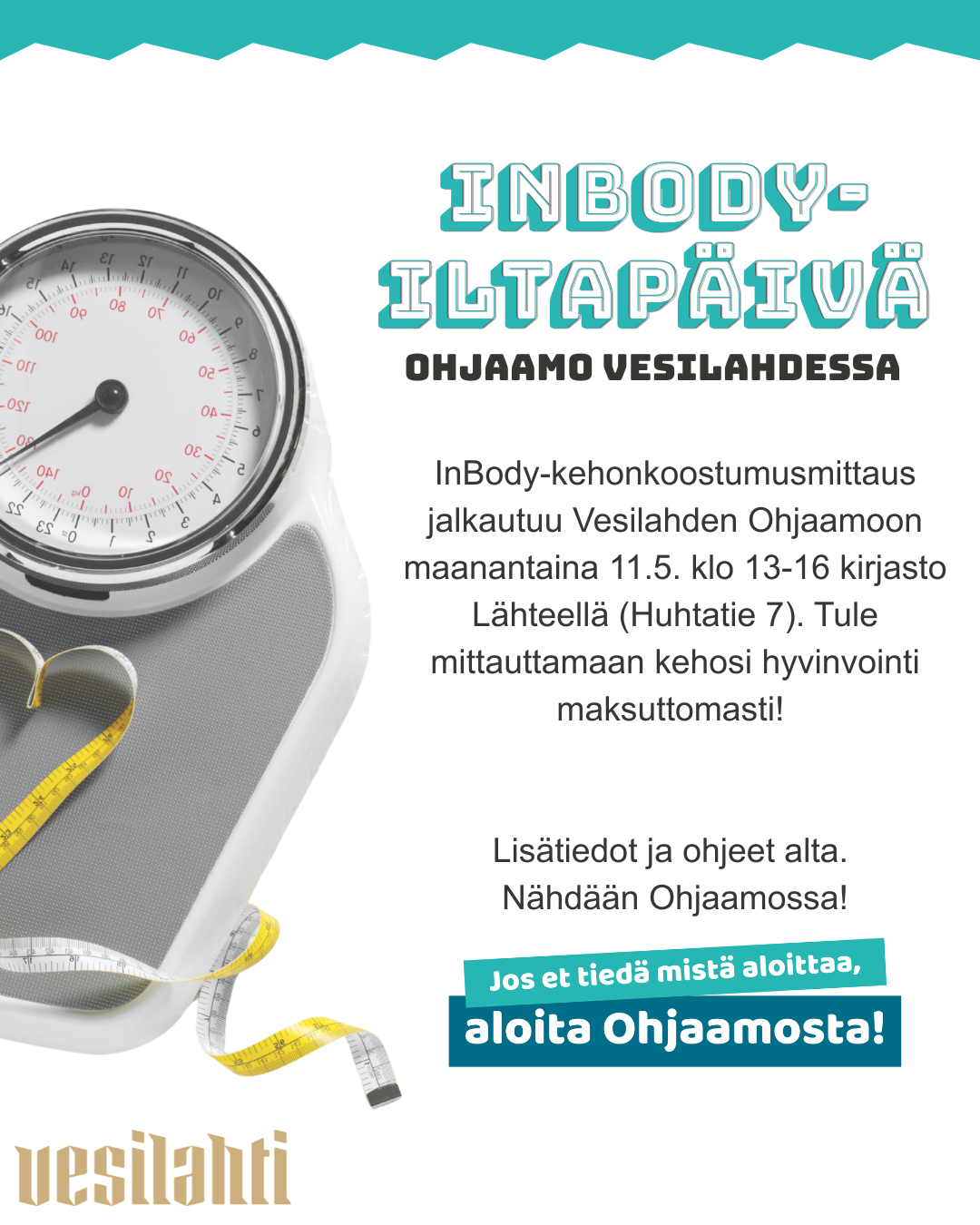 Hei alle 30-vuotias nuori! Haluaisitko selvittää kehosi todellisen hyvinvoinnin? Nyt siihen on mahtava tilaisuus, sillä InBody-kehonkoostumusmittaus jalkautuu Vesilahden Ohjaamoon. Tule tekemään maksuton mittaus, jonka avulla selvität painon, lihaksen ja rasvamassan suhteen kehossasi.